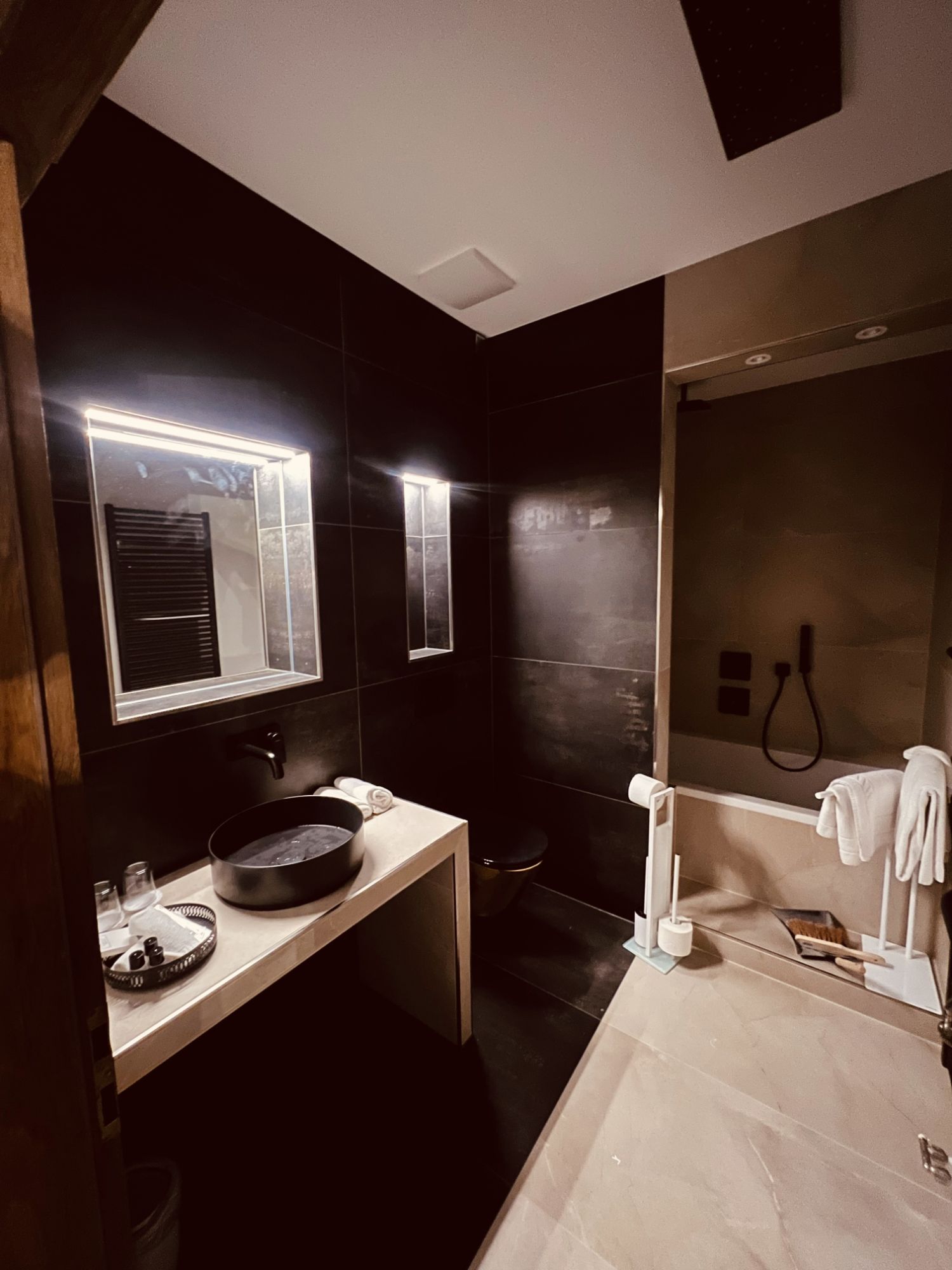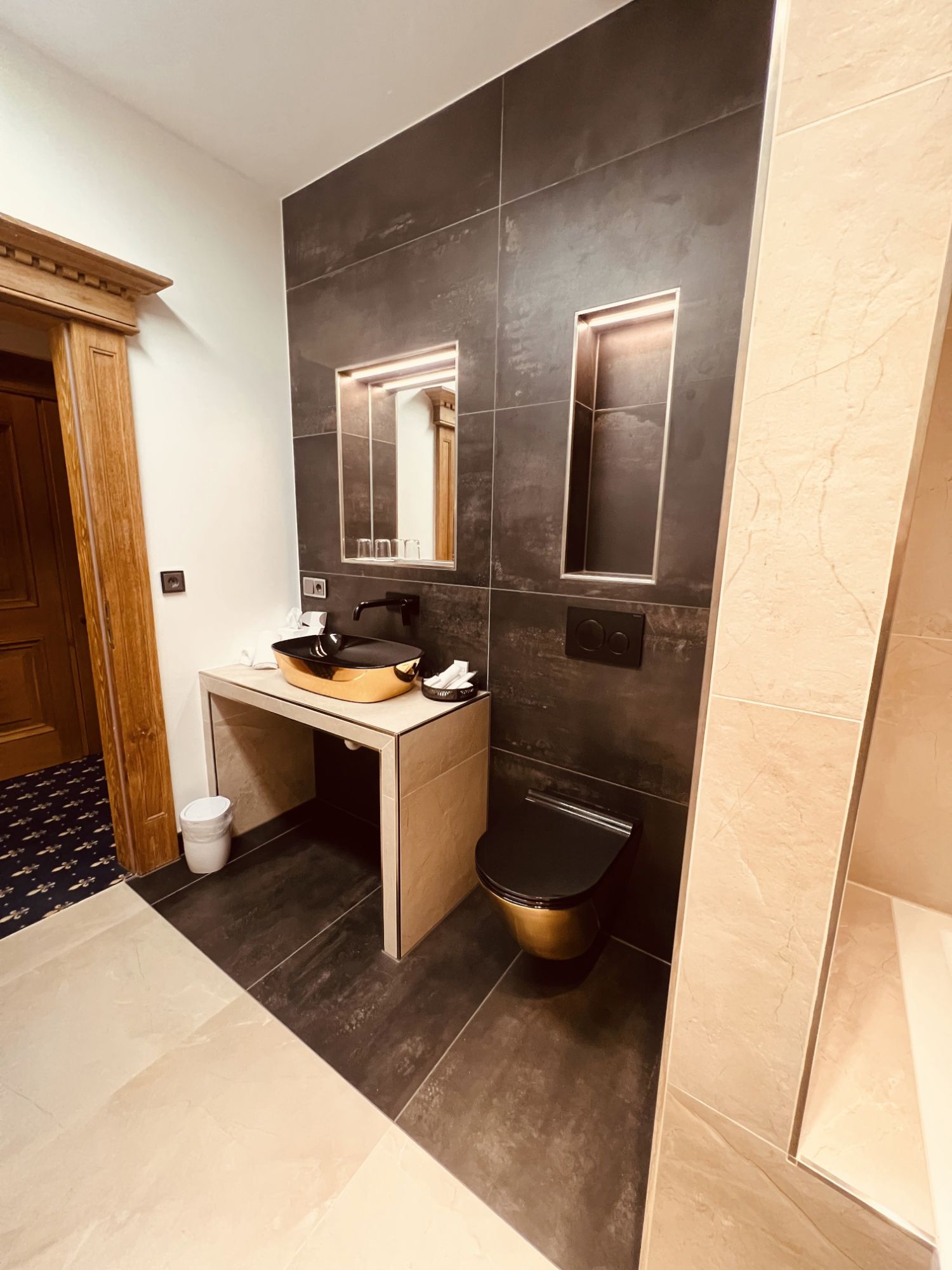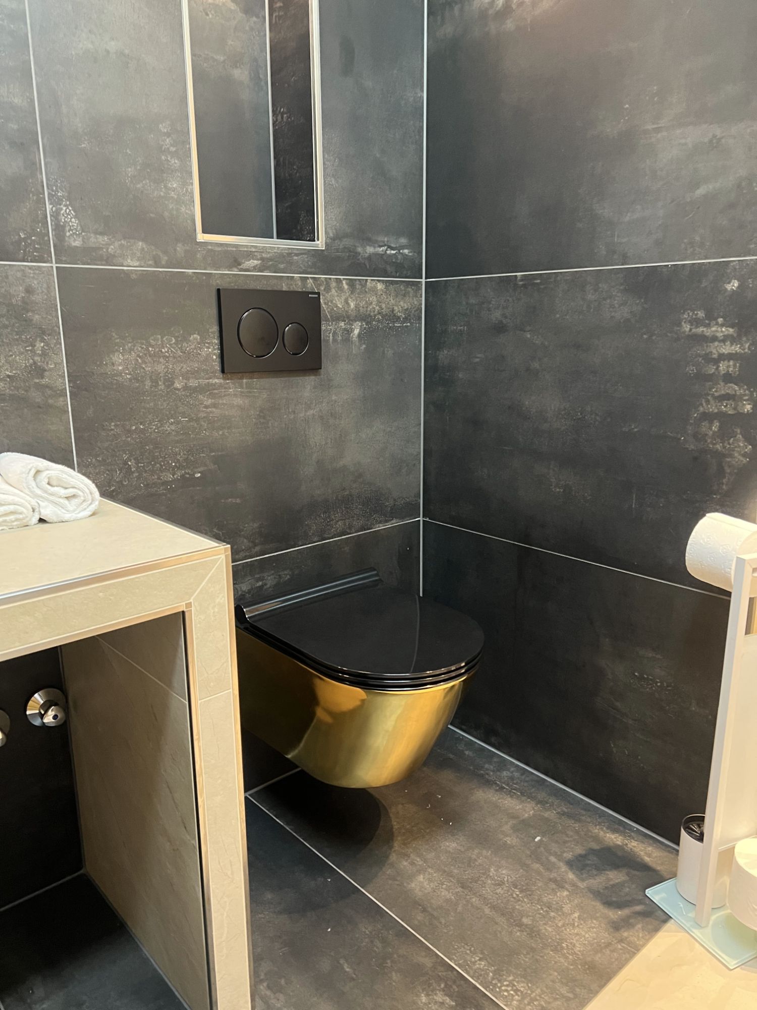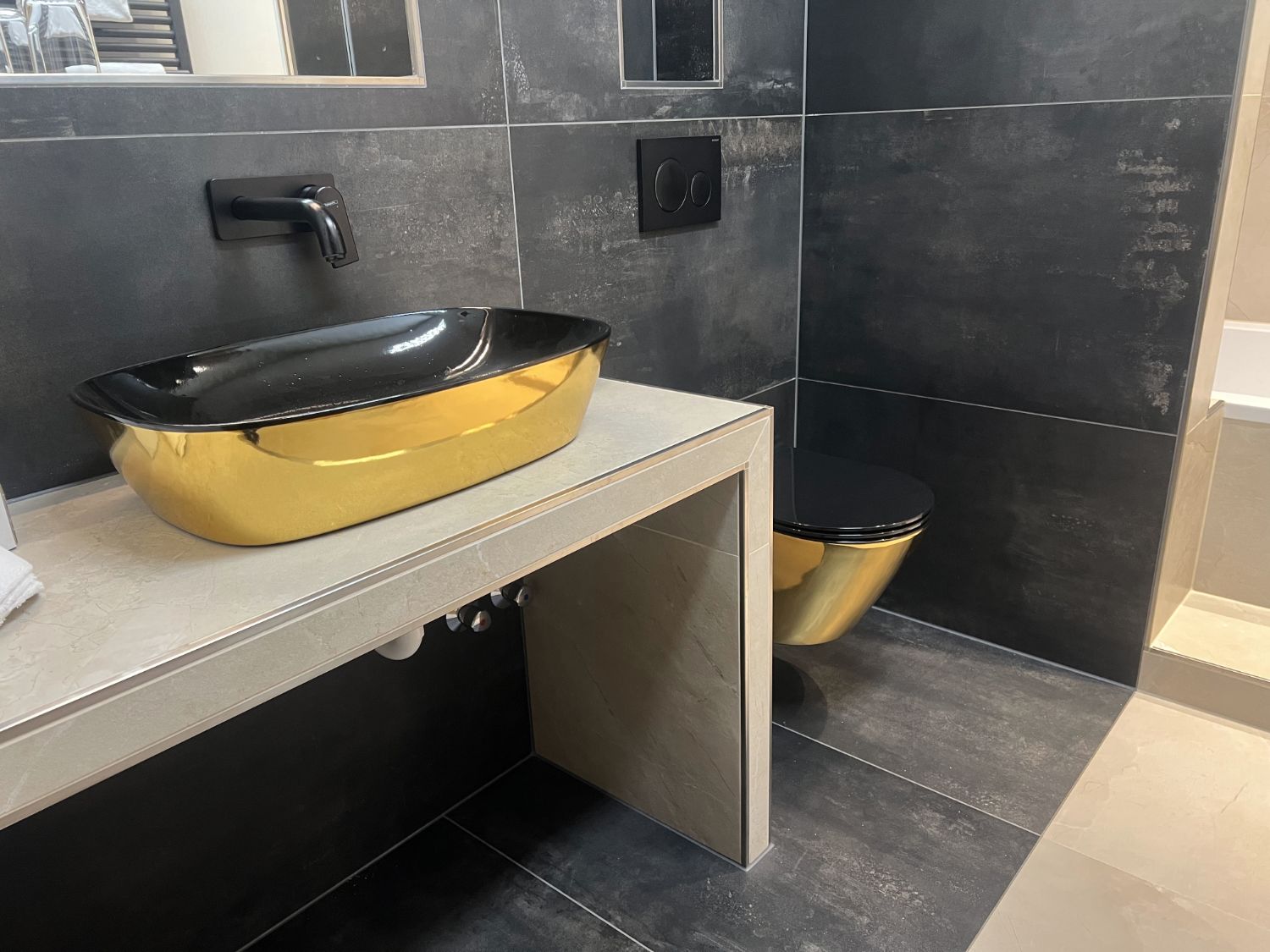 Die Gestaltung überzeugt mit starken Kontrasten: Die Wände sind komplett gefliest – eine Hälfte in elegantem Schwarz, die andere Hälfte in hellem Beige. Das wandhängende WC mit goldfarbiger Keramik und schwarzem Deckel fügt sich harmonisch in das Design. Der Waschtisch ist außen in Gold und innen in Schwarz gestaltet, ergänzt durch eine Wandarmatur. Besonders praktisch ist der tief eingebaute Spiegel mit Ablagefläche für Zahnbürste und Co., daneben eine schmale, beleuchtete Nische – beide sorgen für Funktionalität und edle Akzente. So entstand ein Bad, das Eleganz, Komfort und moderne Technik stilvoll vereint.