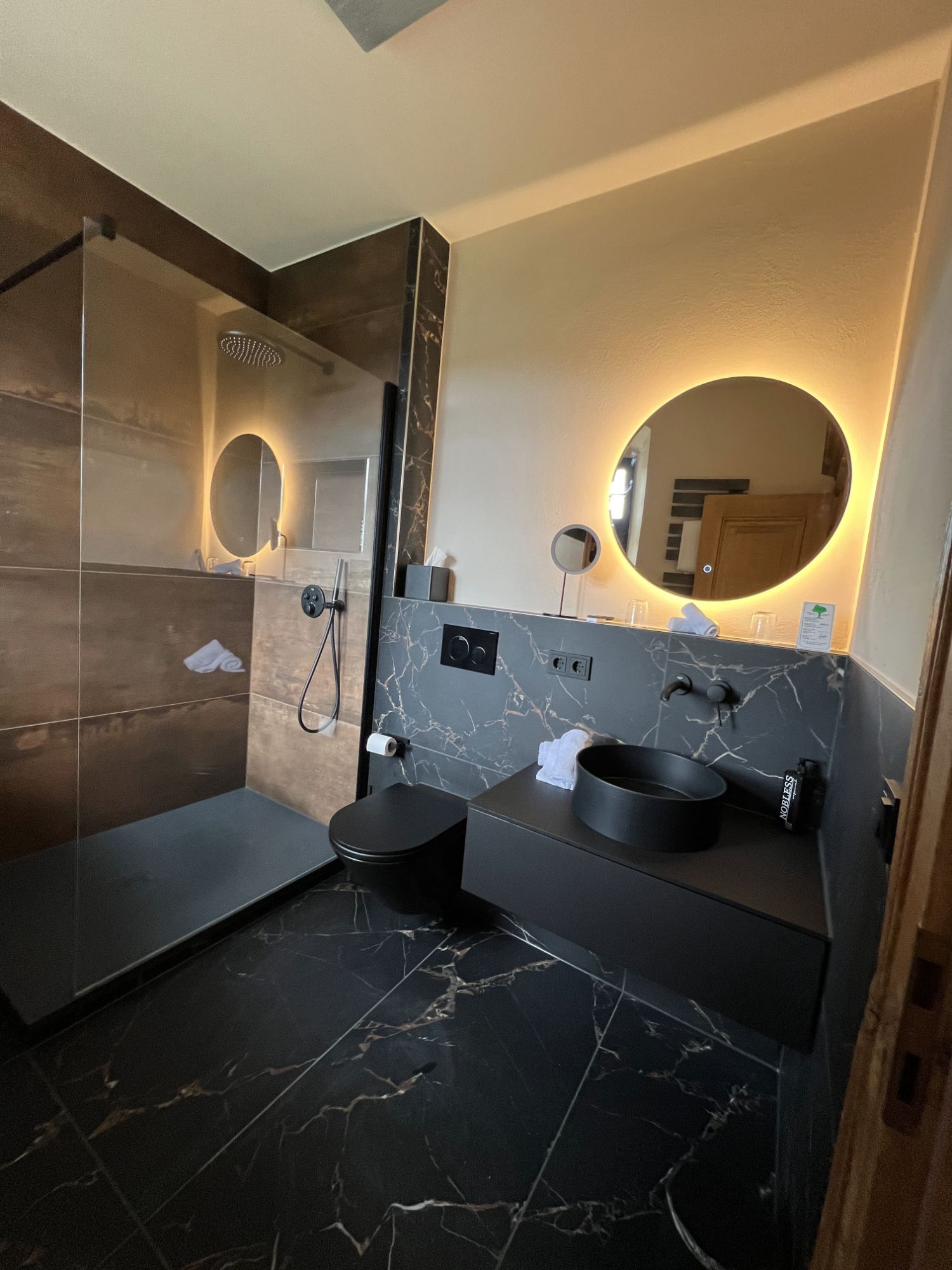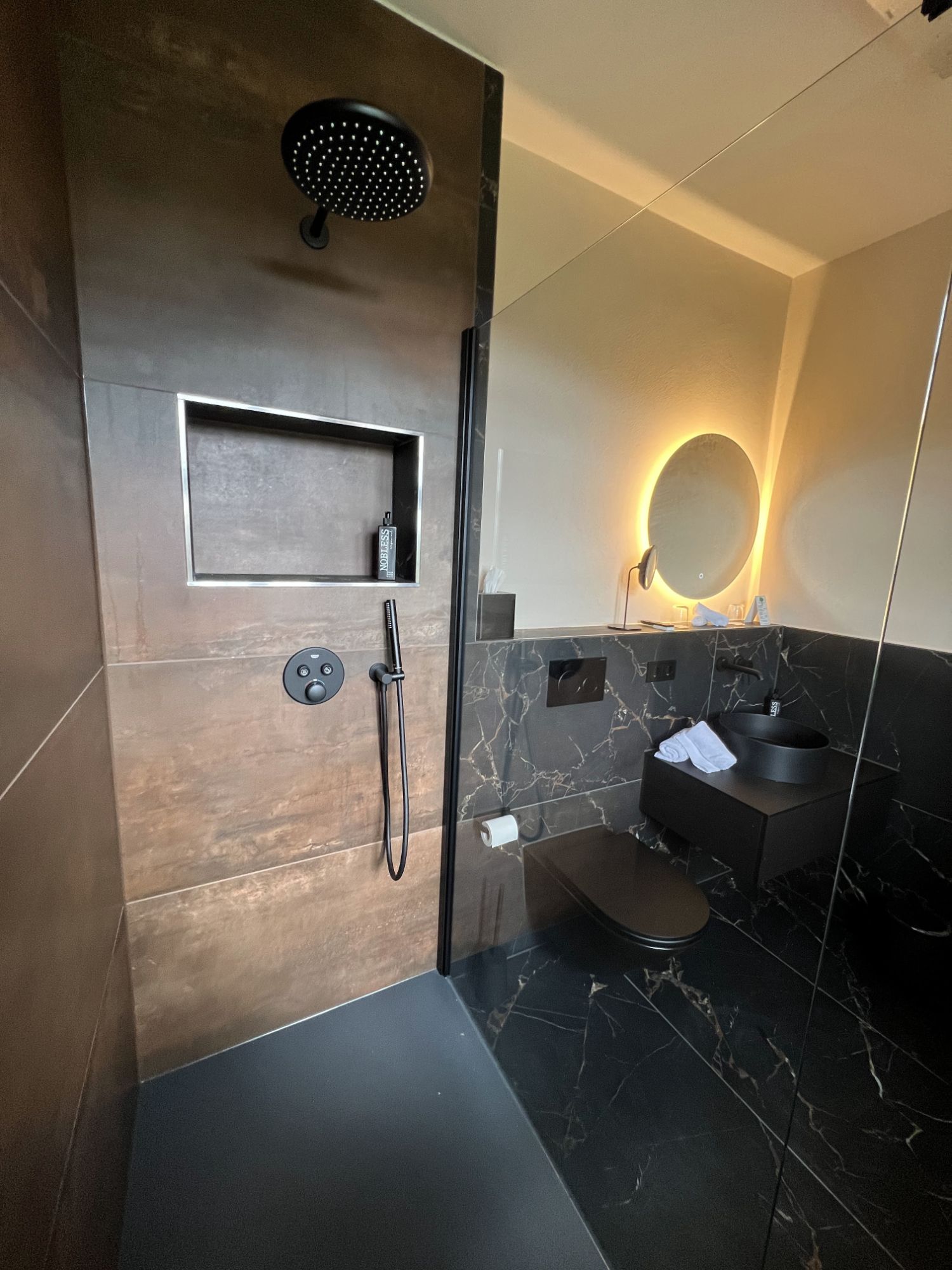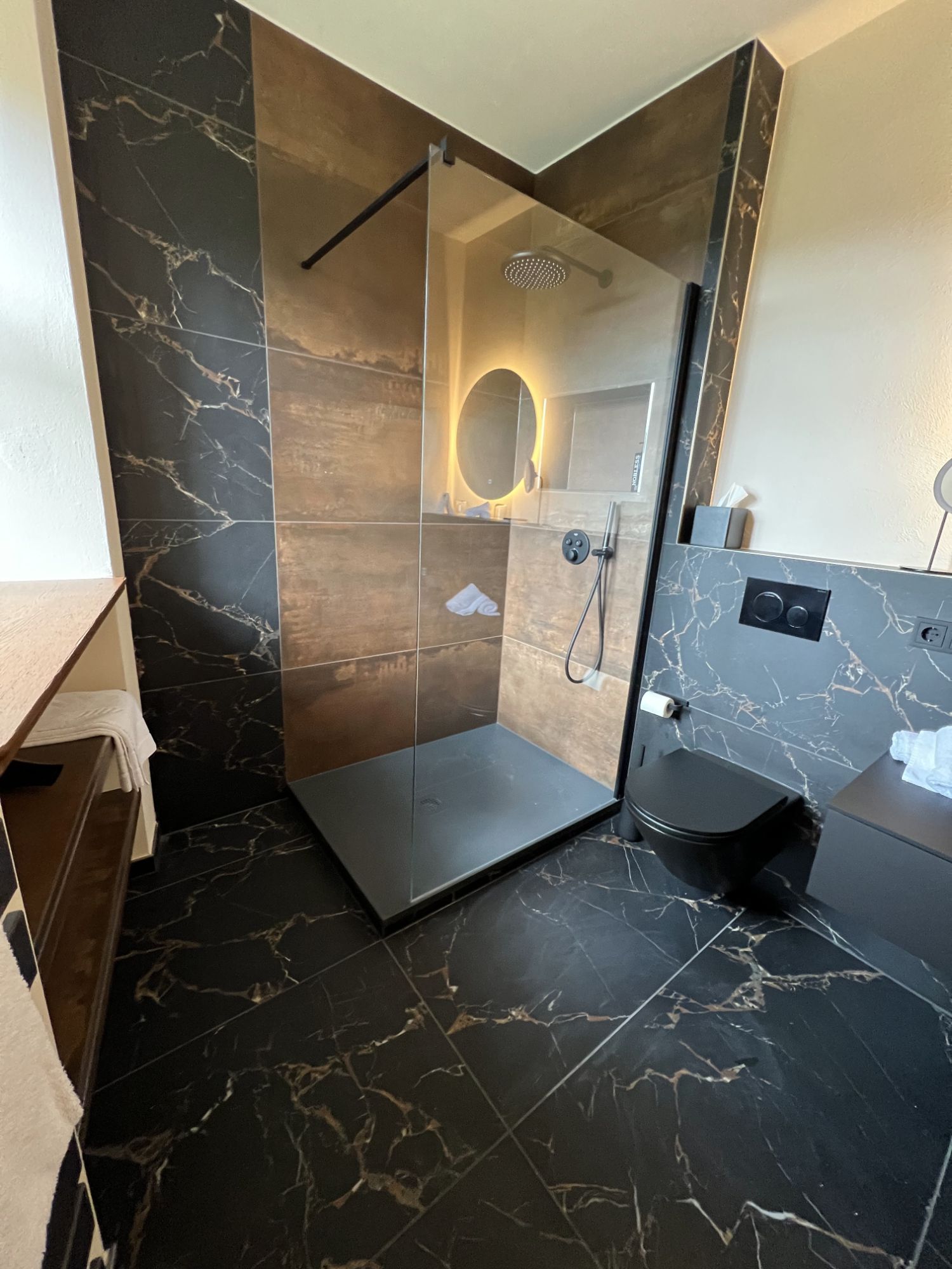 Besondere Details machen das Bad einzigartig: Unter der Fensterbank wurden zwei Regale in der Breite des Fensters integriert, zusätzlich sorgt eine beleuchtete Nische in der Dusche für Stauraum und Atmosphäre. Toilette, Waschtisch und Armaturen sind in edlem Schwarz matt ausgeführt, ebenso wie der Handtuchheizkörper hinter der Tür. Die Gestaltung kombiniert bis zur Hälfte hochgezogene schwarze Fliesen mit hellen, beigefarbenen Wandflächen. In der Duschecke sind die Fliesen bis zur Decke verlegt, ergänzt durch Akzente in Holzoptik, die dem Raum eine warme und stilvolle Note verleihen. Ein kreisrunder LED-Spiegel setzt zusätzlich stimmungsvolle Lichtakzente und rundet das Gesamtbild ab.