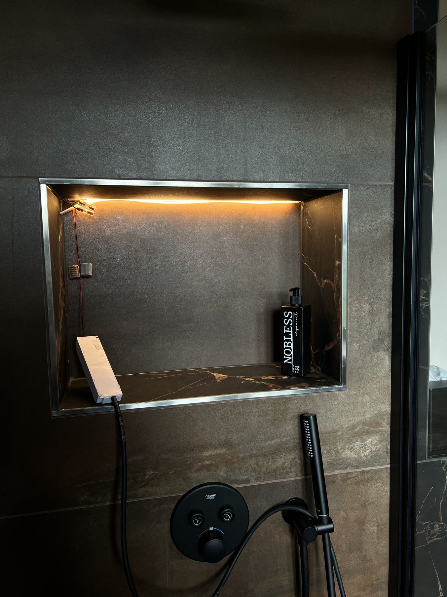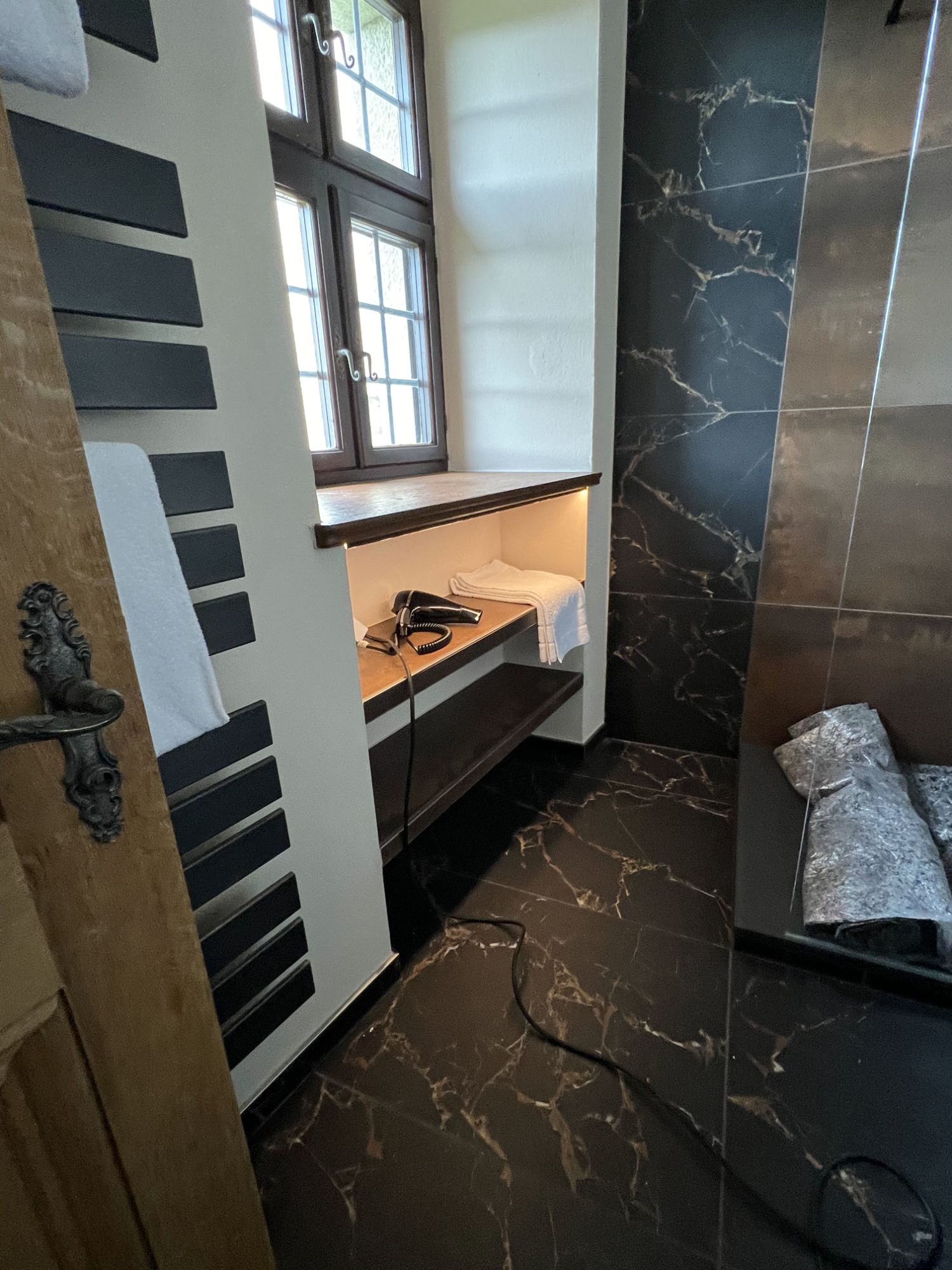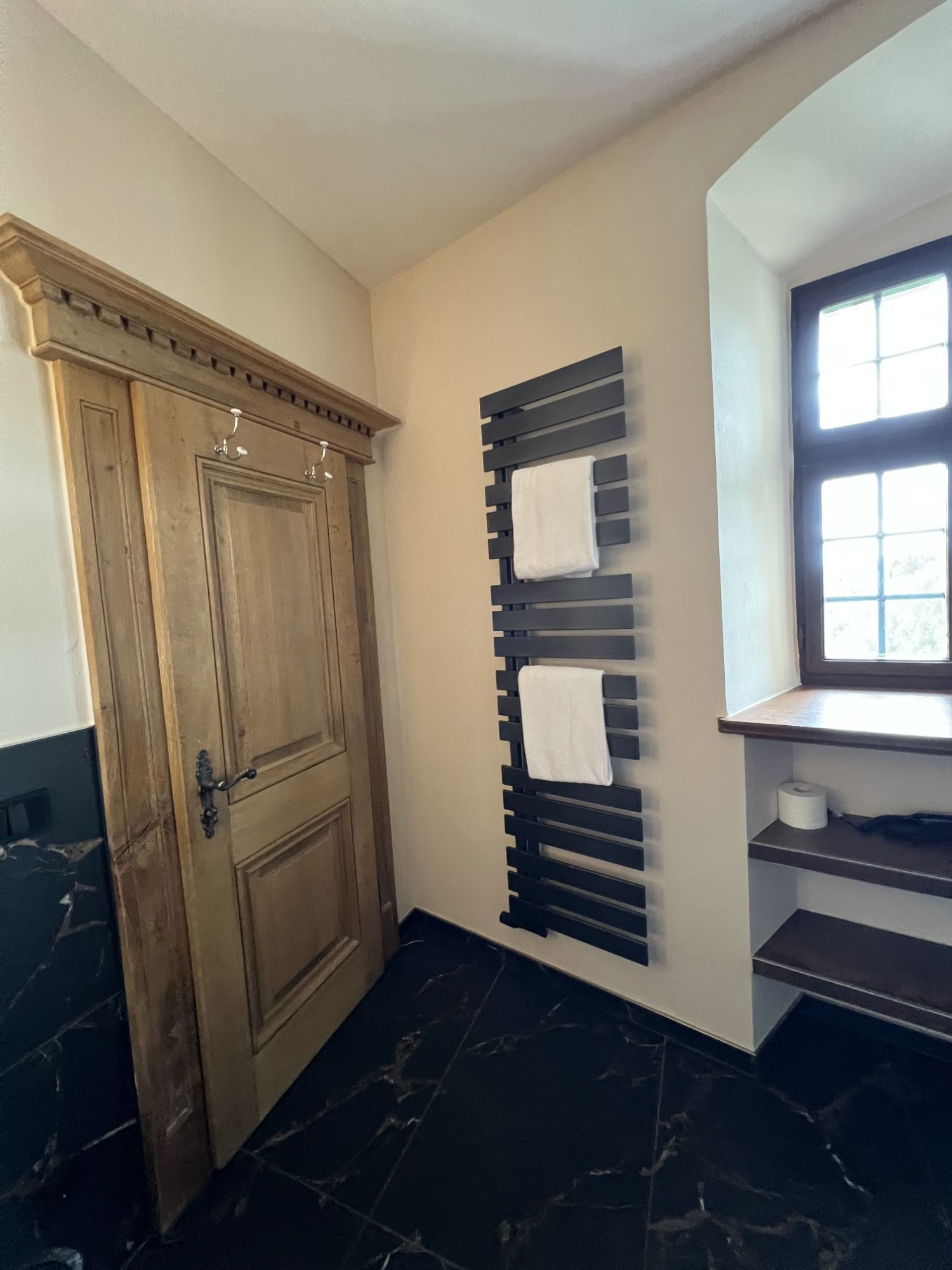 Besondere Details machen das Bad einzigartig: Unter der Fensterbank wurden zwei Regale in der Breite des Fensters integriert, zusätzlich sorgt eine beleuchtete Nische in der Dusche für Stauraum und Atmosphäre. Toilette, Waschtisch und Armaturen sind in edlem Schwarz matt ausgeführt, ebenso wie der Handtuchheizkörper hinter der Tür. Die Gestaltung kombiniert bis zur Hälfte hochgezogene schwarze Fliesen mit hellen, beigefarbenen Wandflächen. In der Duschecke sind die Fliesen bis zur Decke verlegt, ergänzt durch Akzente in Holzoptik, die dem Raum eine warme und stilvolle Note verleihen. Ein kreisrunder LED-Spiegel setzt zusätzlich stimmungsvolle Lichtakzente und rundet das Gesamtbild ab.